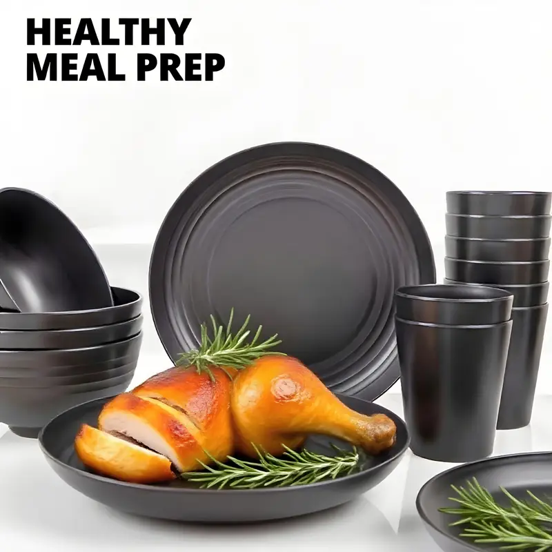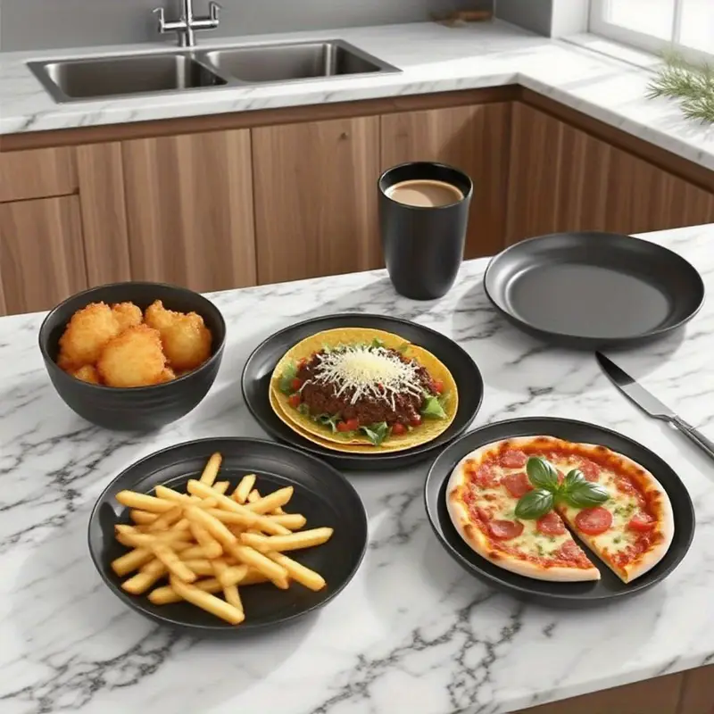 – Reusable Black Collection with 8 Plates, 4 Bowls & 4 Cups |