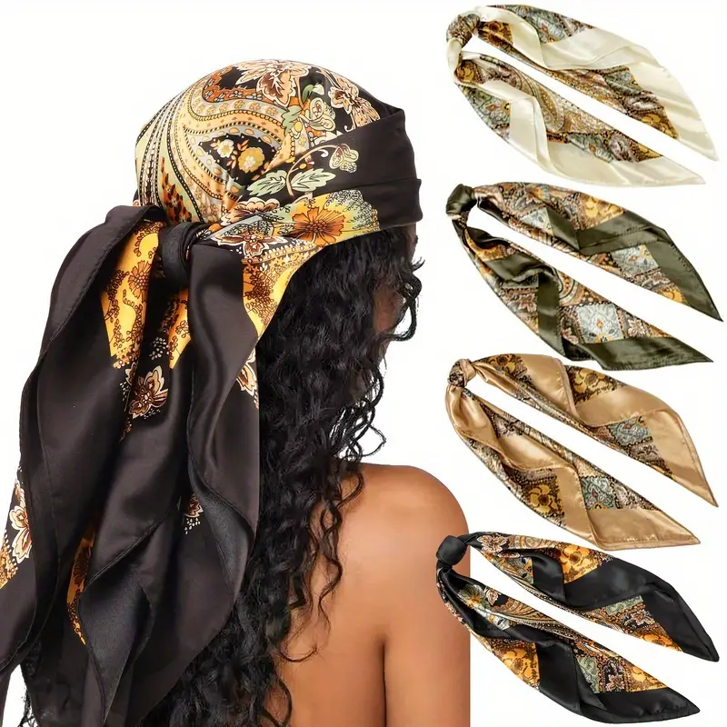 4pcs Women’s Elegant Polyester Square Scarves – 89.99 cm Satin Finish Multi-Functional Neck Scarf & Beach Headband, Black Striped Windproof Scarf for Outdoor Travel, Casual/Formal Event100s, Satin Scarf, Sophisticated Print, Satinlike Fabric