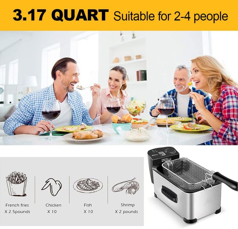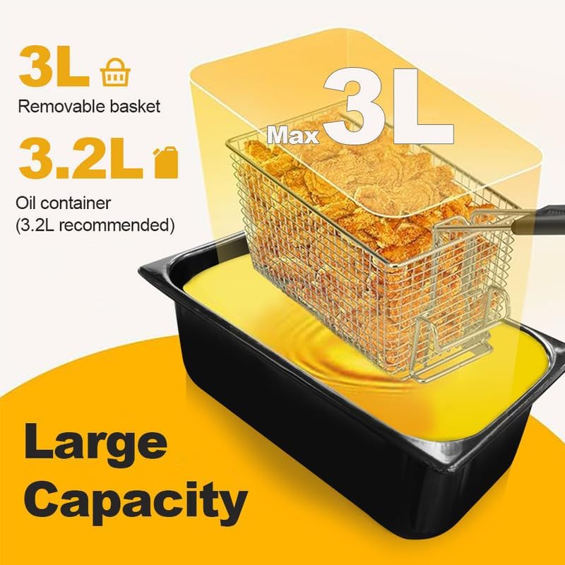 - 【ADJUSTABLE TEMPERATURE & VERSATILE COOKING】With adjustable temperature (194°F-375°F, or 90°C-190°C), this multi-purpose fryer lets you prepare everything from crispy chicken wings, fish filets, meat, to golden French Fries, onion rinsgs, eliminating the splatter and mess associated with traditional stovetop frying.