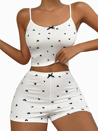 • FEATURES: Heart pajama set, sleeveless, heart print, bow tie front, elastic waistband, crop cami top and shorts set, slim fit, sexy lingerie, cute pjs, 2 piece lounge set