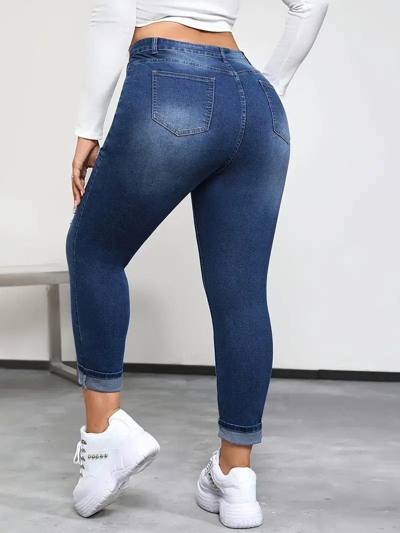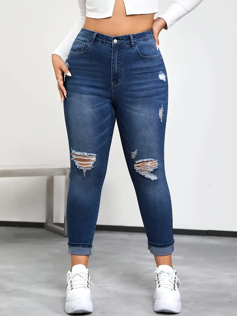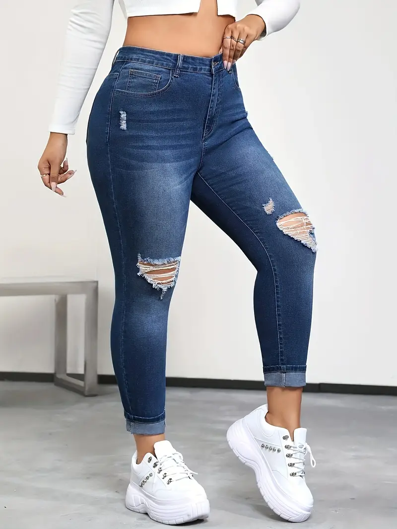 Women’S High-Waisted Stretch Denim Jeans with Ripped Details – Elegant Solid Color,