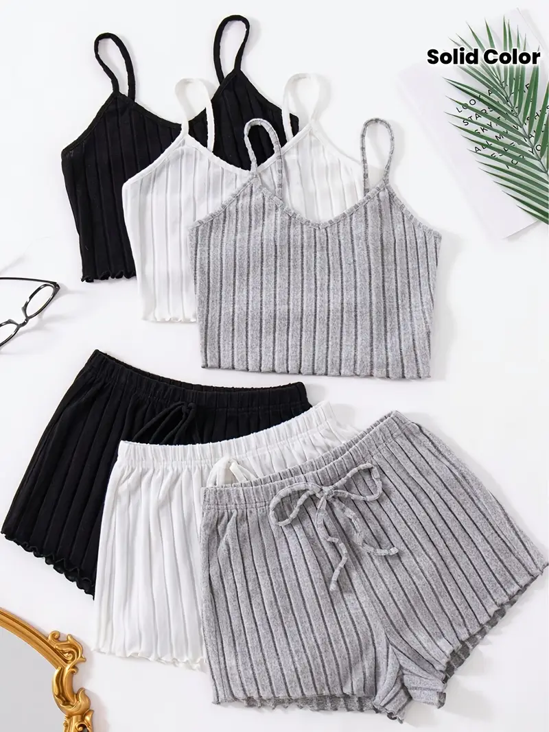 Women’s Home Solid Color Black and White Gray Thong Shorts 6pcs Set